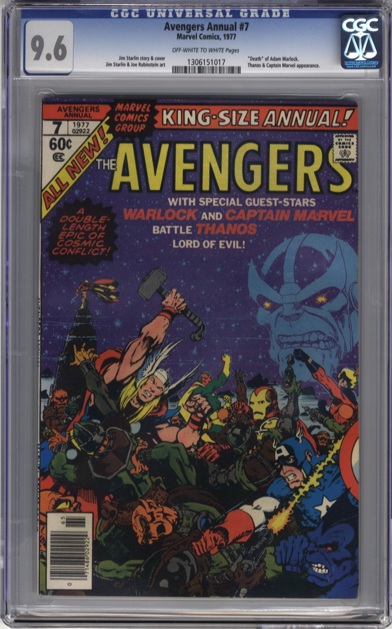Unrestored cents copy. Off-White to White pages. "Death" of Adam Warlock. Thanos and Captain Marvel appear. Damage to the right bottom edge and bottom right corner of the CGC case.